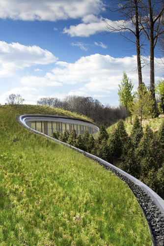 The sinuous glass structure, a synthesis of architecture and landscape design, abuts an existing berm on the property's northeast corner. It's a compelling entry into the 52-acre garden. The building offers a 10,000-square-foot leaf-shaped green roof of over 40,000 plants—grasses, spring bulbs and perennial wildflowers.