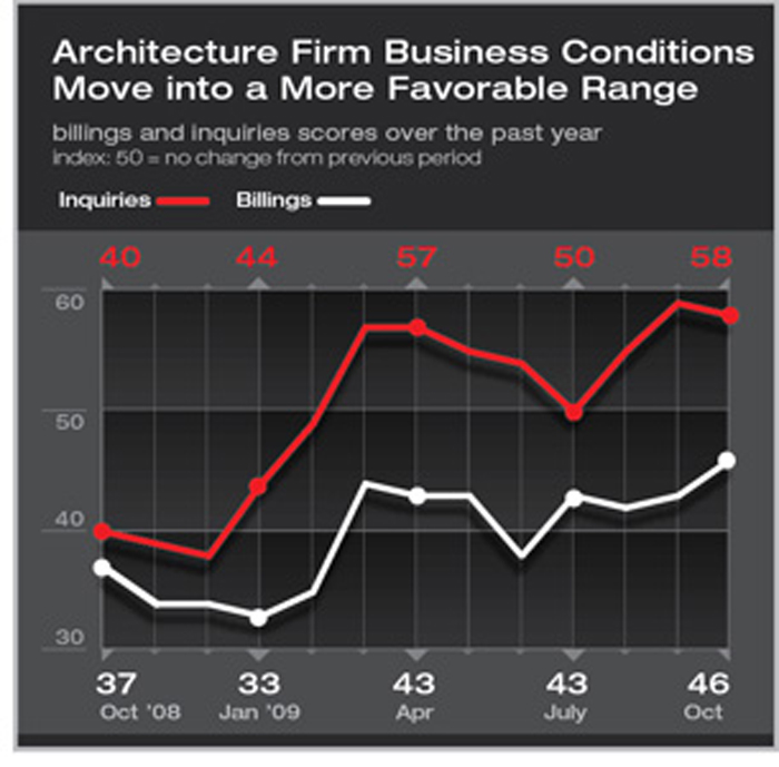 Most firms see 2010 as another challenging year, according to Kermit Baker, PhD, Hon. AIA Chief Economist. U.S. architecture firms reported progress toward an eventual recovery in October, as the AIA’s Architecture Billings Index moved up three points to 46.1. This reading is the strongest since the serious problems in the financial sector emerged in late summer 2008 and points to further improvement in the index in the months ahead. Inquiries for new project activity remained strong.