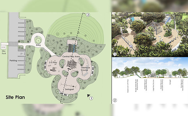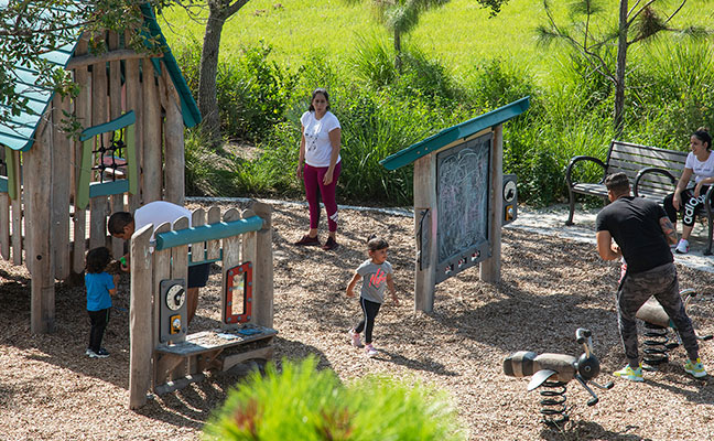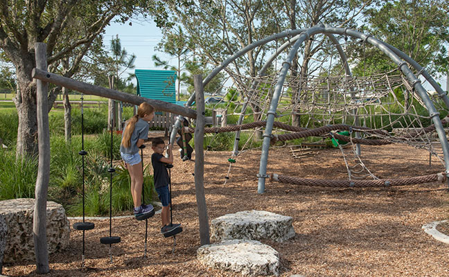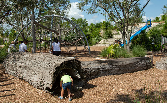 Many of today's playgrounds are designed around specific play equipment situated on an economically sized rubber safety surfacing. These play spaces focus on the manufactured play equipment as the beginning and end of the play experience and offer little connection to nature or the surrounding environment. Camp Matecumbe playground is an innovative play space which breaks this mold and seeks to connect children with their environment. The project's scope included a playground and a parking area. The client, Miami-Dade County Parks Recreation and Open Spaces Department asked the landscape architect to develop a play space which would blend in with the existing nature of the site, particularly with a nearby Pine Rockland preserve. This habitat once covered significant amounts of land in Miami-Dade County, but in recent times it has been reduced to just a few small stands. In addition to blending with the existing nature of the adjacent preserve, our goal was to create an immersive play experience in which the play area would be intertwined with natural elements. Our approach to the design was to create a space that would inspire curiosity of natural things and mimic the exciting explorations children might discover when playing in nature. We also sought to create a safe space that would allow children to run around freely in a large open area and explore their environment. The new playground is defined by pathways and open spaces covered in engineered wood fiber (EWF). The woody EWF provides ASTM certified head impact safety while also providing a naturalistic feel. The play spaces and pathways intermingle with native planting islands planted with large mature specimen Live Oak trees and Slash Pine trees. The oaks for the project were carefully selected for naturalistic characters, with gnarled branches, and multiple trunks. The inclusion of mature oaks helps to create an established and natural feel while lending substantial shade for children at play, avoiding the need for artificial shade structures.