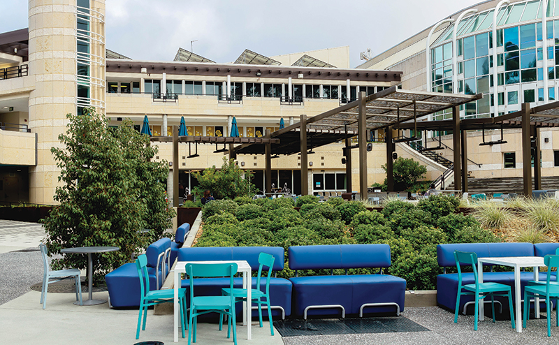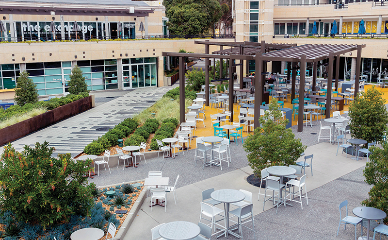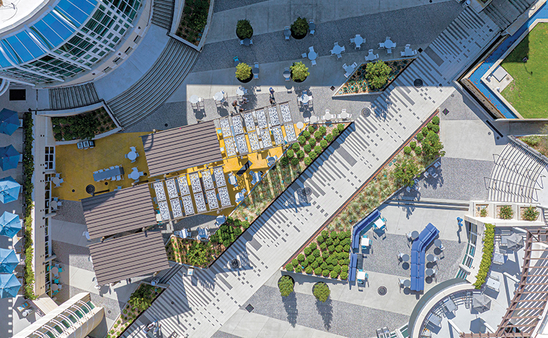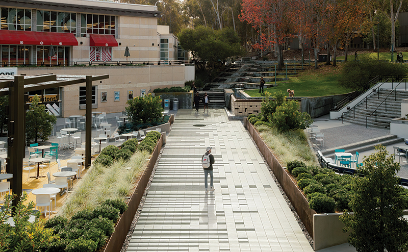 Established in 1989, the University of California San Diego's (UCSD) Price Center West Plaza is located at the campus center for student services and activities. With the help of Landscape Architect Angelina Sotelo and Architect Hector Reyes, what was previously a wide concrete expanse lacking in greenery is now a vibrant hub that serves over 30,000 people who pass through daily. This elevated outdoor experience caters to students and visitors alike with improved social spaces for dining, studying, vending, and promoting opportunities. The redesign centers on connectivity and circulation, stormwater treatment, and much-needed landscaping, complementing the campus's historical modern architecture. Importantly, this space blends the boundaries between indoor and outdoor, aspiring to become the campus outdoor living and dining room for a unique experience. The new plaza harmonizes its roles as a busy campus intersection and social node by combining the needs for traversing and gathering through creating spaces designed to meet these needs. From the library walk flanked by the historic fountain and architecture, pedestrians walking down the existing concrete steps are immediately welcomed into the plaza's new promenade. It was important to establish a meaningful concept to this busy promenade - one that would embody and celebrate school spirit. Those with an affinity for music may notice that the paver pattern in the main walkway is presented with a series of bars that mimic the notes of the UCSD Fight Song. Using a combination of charcoal and white pavers, the patterns emulate the melody of the Triton fight song on a musical grand staff. Each dark segment signifies a note, with its thickness representing the counts and its length indicating its pitch. The measures of the song are then separated by four consecutive white pavers. The plaza's new dining terrace seizes the opportunity to create a seamless indoor-outdoor experience with its dramatic, new shade structure and paving design. Semi-solid, laser-cut panels create intricate weaving patterns of shade and light as the day progresses, inspiring reflection and ingenuity. Finishing the site are fixtures for heating, lighting, Wi-Fi, and speakers in the landscape. The interior food court's radial terrazzo floor pattern extends to the outside with matching bands of enhanced, colored concrete. The prominent yellow flooring beginning at the Price Center East building sees thousands of students pass through the campus's famous "yellow tunnel" into the food court. The yellow floor aesthetic continues onto the dining terrace, visually culminating in the new plaza. The terrace and new shade structure are complemented by new evergreen trees, adorning the site with vertical green relief from the hot sun and creating an urban garden feel.