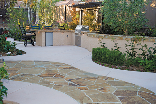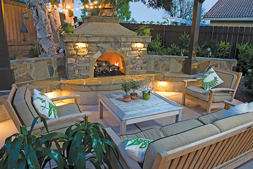 The owners of this Carlsbad, California home offered AAA Landscape Specialists, Inc., the chance to completely remake their backyard. The design goal, according to the contractor, "was to create a family-oriented backyard with room to entertain. The client needed more space and wanted a fireplace, a cover-ed patio area, a place to barbecue and room for a Ping-Pong table and darts." AAA Landscape Specialists, Inc. began by designing a new layout using the Vizterra 3D modeling software system by Structure Studios. Once the client approved the designs, the contractor demolished the entire backyard, including the hardscapes and existing landscape. In total, the company employed three crew members for the initial demo work. Next, workers excavated extensively for the perimeter wall footings. They trenched main lines and drain lines, forming for the concrete, and installed steel reinforcement for the walls and fireplace. A pair of two-man mason crews constructed the CMU block fireplace, seat walls and outdoor living kitchen bar. Eight concrete finishing experts poured more than 19 cubic yards of concrete for the patio and poured-in-place bar countertop. The construction team poured footings, flat work and other hardscaped surfaces, including building walls, fireplace block work and stonework. They installed lighting, a barbecue counter, finished irrigation and drainage, and installed arbors and a patio cover. Overall, the project took 10 weeks to complete. Lighting The company used Unique Vanguard recessed wall lights on the fireplace and under the wall caps. All the lighting wire was direct burial, and was pulled through flex conduits under the hardscape. Workers ran a ???(R)???AE????-inch gas line from the gas meter to the fireplace, which teed off to a ???(R)???AE?-inch gas line for the barbecue. They also pulled electrical line to the fireplace for an outlet and ran electrical to the barbecue area for the rotisserie and refrigerator and extra outlets for appliances. Total Manpower All the workers were AAA employees and consisted of a three-man irrigation/drainage crew, eight concrete finishers, three carpenters, one painter, and a three-man planting crew. They used hand tools, jack hammers, masonry saws, and shovels to install more than six tons of Cameron flagstone, 19 cubic yards of concrete, one ton of steel re-bar, 16 cubic yards of decomposed granite, eight pallets of CMU block, and 2,000 pounds of amended soil.