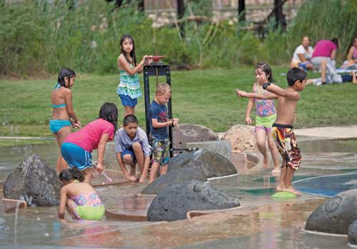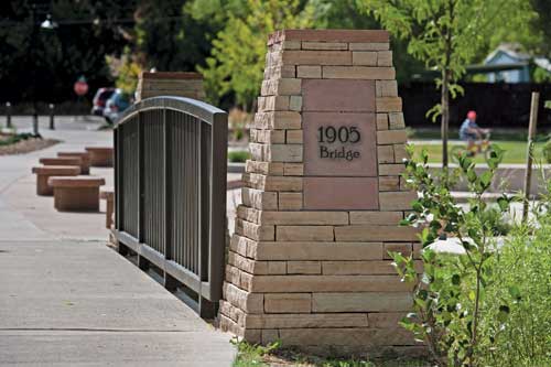 Creekside Sustainability The success of Centennial Park belies some challenges along the way. One challenge was designing the park, which is located in a flood plain, to accommodate occasional floodwaters and seasonal high flows from the creek. We had to ensure that bridges and other infrastructure could withstand flooding and be cleaned up quickly and maintained efficiently. We commissioned several flood analysis studies, and based on the results, located the pump house, shelters, seat walls, and interpretive signs and structures above the potential high-water mark so that flood waters could flow through the park without damming the creek with debris. We also relied on an environmental assessment of the site to ensure our master plan design protected Rifle Creek and its surrounding wetlands, native areas, and animal habitat.