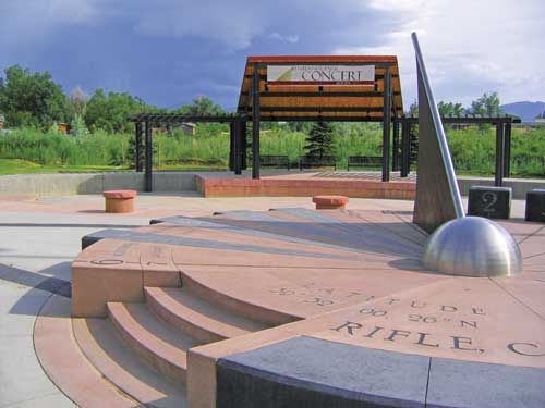 Another popular feature is the Great Bowl, a large oval green designed for informal games, festivals and community events. Also woven into the creek trail corridor are an amphitheater, a sprayground, three gateways, picnic shelters and trails. Art is evident throughout the park in elements such as a supersized sundial. Pathways and stone wayside signage are embedded with sandblasted quotes about Rifle?EUR??,,????'???s history, images of the sun and moon, clock designs and metal cogs. In the sprayground are hydraulic devices, such as an irrigation head gate, referencing Rifle?EUR??,,????'???s agricultural history The park also provides open space and passive recreation opportunities for neighbors and safe pedestrian connections over the creek to Rifle Middle School, downtown and other city parks. New municipal infrastructure at the park includes pedestrian bridges, parking lots, an irrigation pump station and a dam on Rifle Creek.