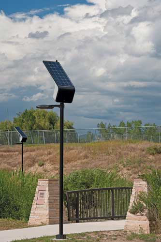 A $40,000 Garfield New Energy Communities Initiative grant paid for most of the $57,000 cost of installing 11 off-grid solar-powered light poles that illuminate the creek paths. The 15-foot steel poles have a solar panel, a battery pack and the lighting fixture mounted well above floodwaters. The solar panels charge the battery during the day. The freestanding lights gave park designers more flexibility in deciding where to locate lighting without worrying about the costs of extending an electrical conduit to each pole. The downlights use LED bulbs, which require less electricity and are expected to last 15 years.