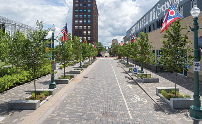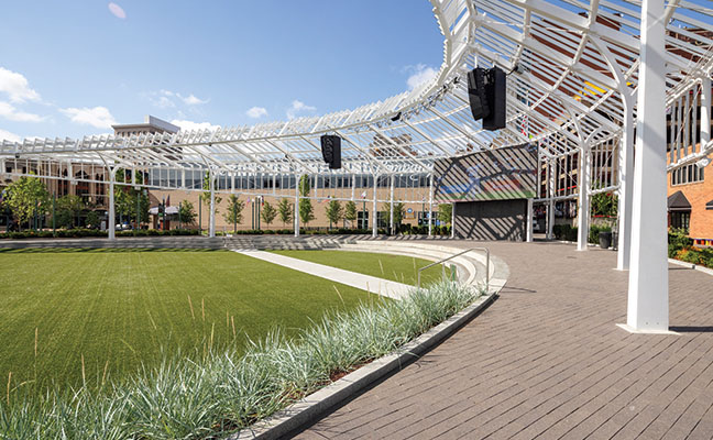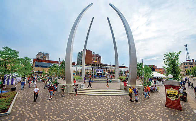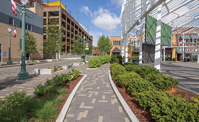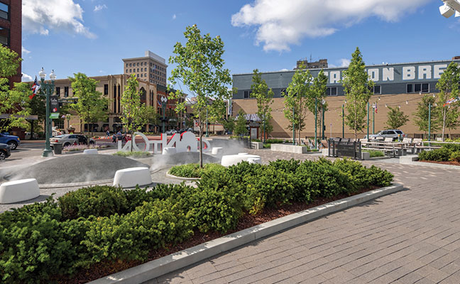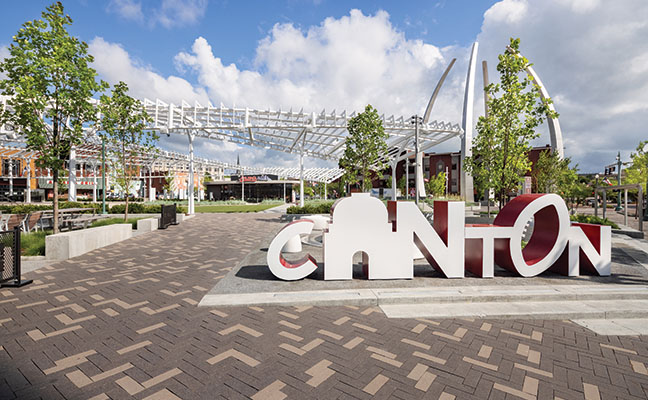 Centennial Plaza offers a bold vision for the city of Canton, Ohio, and its residents. Inspired by the city's rich history, the design establishes an iconic presence downtown, utilizing a variety of social spaces and architecture that will inspire residents for years to come. For the past three decades, the city of Canton has endeavored to provide for its citizens a central public space that would be both iconic in its design and transformative in its approach to encourage economic development, strengthen the downtown core, and enhance surrounding neighborhoods. Beginning in 2014 with several completed projects, new businesses, and regional attractions, including the Pro Football Hall of Fame and Village, the city has generated tremendous momentum by creating new commercial activity, residential growth, and entertainment experiences. Origins The Centennial Plaza project was initiated in 2016, with the city council's design phase authorized in 2018. The project broke ground on August 28, 2019, and notwithstanding the worldwide COVID-19 pandemic, Centennial Plaza reached substantial completion on November 20, 2020. Initially, investment in a central public space had not taken place but with the help of funding from the citizens and businesses of Canton, Centennial Plaza became that investment, establishing a central green space for the community and another regional destination for visitors. The plaza takes cues from Canton's rich historical and manufacturing heritage. As the hometown of President William McKinley and the birthplace of modern pro football, Centennial Plaza provides a link to its past while offering a bold vision for the city's future. It is an essential building block in creating a vibrant downtown with the ability to generate day-to-day activities and host major events, serve as the city's public square for the entire community, and provide a memorable landmark for all visitors. A cohesive and continuous space designed to bring members of the community together through music, art, and food, the design called for a unifying paving strategy with accessible routes that spanned the public realm (streets) to the private domain (plaza) and from building face to building face along 3rd Street, 4th Street, and Court Avenue. The city also expressed a desire for a more modern appearance to the plaza, one that would present a forward-thinking approach that aligned with their long-term goals of reinventing the downtown core.