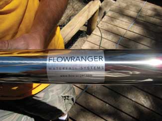 A skimmer was installed at the end of the pond, which is where the two pumps are located, to power the waterfall. Placing the skimmer is important because where it sits determines the water level. A laser level/transit was used to determine the level. Two Tsurumi pumps were used to pump 4,500 gallons per hour, for a total of 9,000 gph. Together, the two pumps push water through 200 ft. two-inch flexible pipe to create the waterfall’s flow.