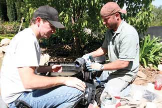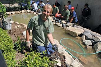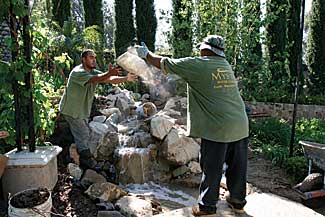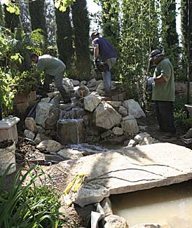 The 45-ft. re-circulating stream was created at the hilltop home of Javier Reyes, owner of Villa Park Services in Anaheim, Calif. Pond and irrigation supply outlet Hydro-Scape Products, Inc. organized the event–with Steve Sandalis of Mystic Water Gardens the lead instructor and builder.