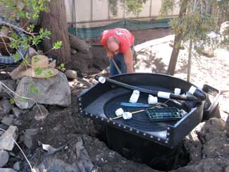 The builders selected a down-flowing area between the main house and tennis court. The first step was excavating to create an upper pond—a job completed with shovels because the area is not accessible to excavators. Then the 4-ft. waterfall was sent over an existing retaining wall to spill into the 45-ft. stream to end up in an 18×10-ft. pond. Because the land is sloped, the crew mounded up curved berms to enclose the stream. Pipes, of course, were laid down before the berm so soil could be shoveled on top of the pipe, lessening the amount of trenching required.