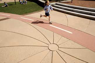 Areas are designated for hopscotch and four-square play within the intricate paving patterns along with zones of synthetic turf and rubberized surfaces. Due to the high volume of foot traffic, it was essential from a design and practical sense to provide surfaces favorable to such use.