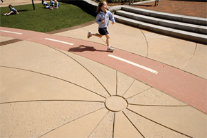 Scored patterns and textures are located within the two-toned colored concrete, with a tricycle path weaving through the entire space. Areas are designated for hop-scotch and four-square play within the intricate paving patterns along with zones of synthetic turf and rubberized surfaces.
