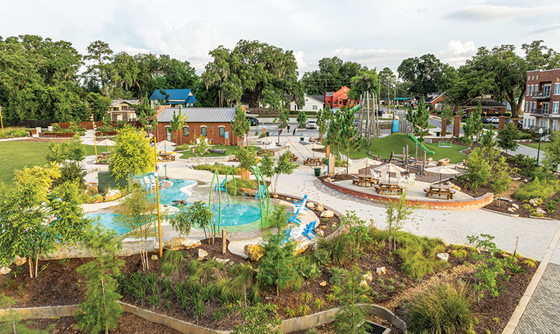 Chason Park in Bainbridge, Georgia, uses play as a medium for place-based storytelling, translating regional history, ecology, and economic heritage into physical experiences for users of all ages and abilities. Originally dedicated in 1921 as J.D. Chason Memorial Park, the site sits on a prominent bluff between downtown and Flint River. For much of its life, the park served as a passive greenspace, but as the city approached its centennial, they set out to transform the underutilized site into a more active, multi-generational destination that could reconnect downtown to the river and function as a signature civic space. A broad outreach effort by multidisciplinary firm TSW revealed strong interest in river access and a deeper understanding of local history and natural systems, resulting in the "River Story" concept that organizes park features and areas around river-based themes while establishing a consistent interpretive framework across the site."Towering Timbers" PlaygroundThis 5-12 play zone focuses on the historical uses of pine timber and its role in Bainbridge's economic development. The area includes a large tower, two slides, a climbing wall, and multiple climbers and steppers. Primary materials include robinia and white oak, selected for durability and tactile quality. Wood elements incorporate custom carvings, while custom GFRC components reinforce and extend the interpretive narrative embedded throughout the play experience.