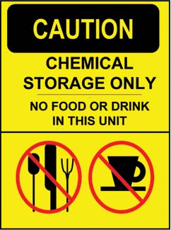 Signs warning of dangerous chemicals should be posted on the doors and windows of the storage unit.