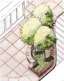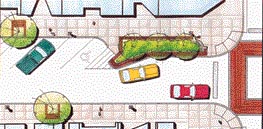 While the sponsorship program presented some unusual design challenges, the project also contained the usual issues embodied in most street designs. There was an opportunity to reuse granite curbs removed from other city streets. The use of granite curbs prompted a reconsideration of the conventional crowned road design. As Project Manger Edd Evans, ASLA, describes, "The aesthetic qualities of the granite curbing would be ruined by a concrete curb pan so the drainage of the street was designed to collect in the center of the asphalt area, between the on-street angled parking and the road. That drainage pattern also ensures positive drainage in some of the more level sections of the street."