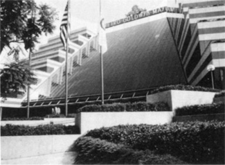 The prominent feature of this landscape is a 16-ton, 35-foot tall, multitrunk Kentia palm in the building’s lobby. The plant was grown specifically for the Filmland project.