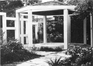 A post modern gazebo and open frame wall designed by Kenneth Lee Coverdell for the Taylor residence in Hillsborough earned Blue Sky Designs, Inc. of Half Moon Bay the special effects trophy. This award recognizes the best use of unique methods or materials, and/or special artistic effects.