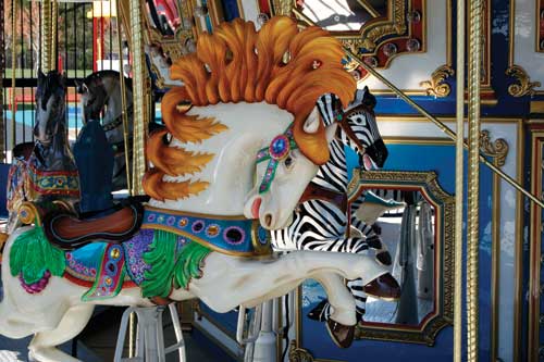 A carousel with 14 animals and three chariots sits at the center of the park, one of the elements requested by the park?EUR??,,????'?????<???EUR?s benefactor, Mrs. Adele Lebowitz. The carousel platform is flush to the concrete to allow wheelchairs.