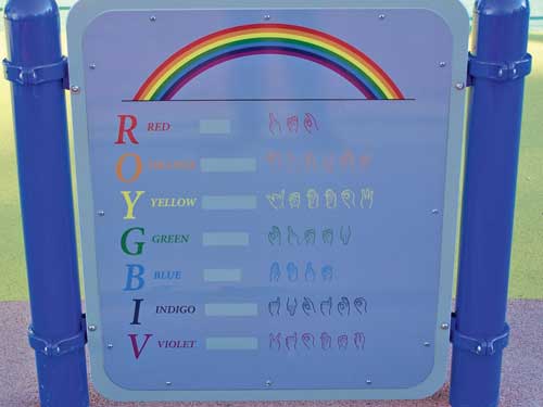 Rainbow Room The Rainbow Room features swings and is brought together by a rainbow. Autism is a spectrum disorder. That means that children with autism can have very different symptoms. They can, for instance, be drawn to a color, or repelled by a color. The rainbow room provides an opportunity to see, touch and embrace an element of nature. The rainbow is translated into an understandable series of colors: ROY G. BIV (red, orange, yellow, green, blue, indigo, violet.) The room is filled with all kinds of equipment with swinging or swaying motion. This repetitive use of swinging and swaying equipment and color is not only fun, but is a link between the motion of swinging and the object. Colors of the rainbow are reinforced as the colors of the equipment change with the color of the soft surface. The colors of the rainbow are explained in a picture sign with Braille, sign language and English. The rainbow arches and the rainbow sign are original designs.