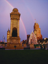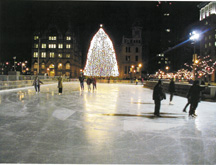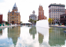 For nearly two centuries, historic Clinton Square in Syracuse, New York has been the focus of public attention. Whether it was the shipping or unloading of cargo from Erie Canal barges, ceremonial events, the circus, parades or memorial services, Syracuse has always looked to the square as its public gathering space. Its evolution has been dramatic as it spanned 200 years of continual change. The first hundred years found the square serving as the strategic center of an upstate transportation network of rudimentary roads, railroads and inland canals. Clinton Square became the active commercial hub for merchandise delivered by barges on the prospering Erie Canal that cut directly through the square on its way westward. Hotels, banks and public buildings quite naturally appeared there bordering the square as a result of this expanding commercial activity. From 1906 to 1910, a 70 feet high stone monument with bronze statuary was erected on the northern half of the square to honor the local Civil War veterans. Ever since it?EUR??,,????'???s dedication day in September 1910, this imposing, historic form has been the prominent focal point of the square. When interest in the Erie Canal waned in the early 1900's because of newer and better modes of nsportation, the old Erie Canal and basin area in Clinton Square was filled in and paved creating a large, prominent open space. This space was quickly taken over by the new mode of transportation - the automobile. Soon thereafter, a major east-west road, Erie Boulevard was constructed in the now defunct Erie Canal right-of-way, effectively splitting Clinton Square into two north-south segments of unequal sizes. The 1940's saw the square evolve into a more park-like setting with several individual islands of lawns and plantings and even some small classic fountains. Despite the physical splitting of the square by either canal or roadway, the square still functioned as a special public gathering space to honor and celebrate all manner of occasions. In the late 1970's, the Urban Renewal movement indirectly forced the City to seriously seek redevelopment efforts for Clinton Square. A new cascading fountain design with an integral depressed sitting area was constructed incorporating a few of the original canal wall capstones to create a mild historic overtone. This new design soon found disfavor with the public however, because of its inherent maintenance problems, accessibility issues, and a general uncomfortable feeling with its depressed sitting area. Over time, skateboarders and illicit activities only compounded the growing unattractiveness of the space. Then, after years of local political and historical discussion on what should be done with the square, now seriously deteriorated, the decision was finally made in 1999 to once again redevelop Clinton Square. Only this time, the change would truly be dramatic and unifying. Revitalizing the Area Since the filling of the Erie Canal in the 1920's, the old channel right-of-way had served as a predominant, continuous traffic corridor through Central New York that physically split the Square. To accomplish the goal of recapturing the entire space for public use, a strategic one-block section of the major East-West arterial through downtown was closed allowing the Square to once again be designed as a unified public space. A series of traffic studies indicated that an efficient rerouting of traffic around the Square would not significantly impact either normal or rush hour traffic movements. They in effect validated the decision to pursue the redevelopment of Clinton Square. Having all the prerequisites of traffic concerns, funding sources and a design consultant in place, the design contract was finally awarded in early March of 2000, to Clough, Harbour & Associates (CHA), a multi-disciplined transportation, engineering, landscape architectural and planning firm. They were immediately challenged by the City of Syracuse in completing the design portion of the project on a fast-track schedule. This meant that all programming, stakeholder interviews, public participation sessions, design reports for funding agencies and their subsequent approvals, the final design, and contract documents would have to be completed by October of 2000. Collaborating on a Dream Clough, Harbour & Associates, LLP began the design process began with a nearly continuous series of meetings with the City to quickly establish strategic deadlines and a "Wish List" of probable elements to be included in the Square. Syracuse?EUR??,,????'???s Director of Operations, Joseph Nicoletti was the City's energetic and enthusiastic coordinator for the project and the Mayor's liaison. Each of the City's Commissioners also participated in a significant way identifying their specific needs relative to public services and maintenance issues. Interviews of 'stakeholders' (both City and private directors/coordinators of public events), the individual requirements of state agencies and political directives comprised the early list. As each public session was held and comments received, the "Wish List" was re-evaluated in conjunction with the established budget and relative to our design principles. It was from these meetings that the core concept of the Clinton Square renovation project was established: To utilize the Square's historic legacy through creating a unified design that exhibits a special versatility in accommodating a large variety of public events. Central to the concept was creating a dynamic, dual-purpose space for the primary visual elements - an integral fountain/reflecting pool and an outdoor ice skating rink for Syracuse's long winter season. Summertime public activities in Clinton Square include concerts, exhibitions, festivals, celebrations and as a passive pedestrian space. In its non-event mode, the square would become an informal, public focal point of aesthetic and historical interest. During the long Central New York winters, th