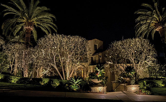 Illuminated Concepts, founded by Chuck Evans in 1988, creates award-winning, outdoor lighting design for residences and commercial entities in the Southern California counties of Orange, Los Angeles, Riverside, and San Diego. Evans, who got his first taste of the industry in New York by doing stage lighting with special effects set to music, pyrotechnical flashes, and innovative projections, started his current business by designing and installing Christmas lighting displays. Soon after he moved on to overall landscape lighting. By 2005, Illuminated Concepts had designed outdoor lighting/landscape lighting for over 5,000 custom installations in Southern California. A Pacific View The project featured here, was for the Wu Estate located in the exclusive enclave of Newport Coast. Evans' assignment was to completely renovate the old, out-of-date landscape lighting system with new cast brass LED fixtures, and a comprehensive redesign. To accomplish this, it took 197 fixtures and four transformers with astronomical timers. The lights included MR-16 bullet lights, MR-11 bullet lights, bullet lights with adjustable shields, mini wall washers, underwater lights, mini path lights and regular path lights. The overall goal was to accent and enhance the many architectural and landscape features of this distinctive home. "When I present a lighting design proposal, I emphasize the effects and not the fixture selection," Evans states. He relies on fixtures that have drop-in lamps so he can choose from a multitude of LEDs with varied wattages and beam spreads. This gives him the flexibility to use the exact lamps to create a desired effect. The Front Yard Here, it was important to accent the fine architectural features of the home. According to Evans, this was achieved with a combination of facade graze lighting and shadow lighting. "I love to create texture with lighting," he states. There were two ways he set out to accomplish this.