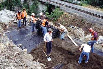 As a result, repair crews simply excavated down at the toe of the wall in the impacted area and then installed a drain line to capture and reroute the excess water across the bike trail and then downhill. To establish vegetative cover quickly for these greenwall structures, ODOT hydroseeded the completed walls.