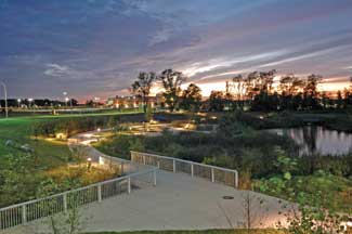 As a further concession, the project team created a series of rolling, irregular berms to further obscure noise and views. OCBA?EUR??,,????'???s Peregon acknowledges the original site plan had not called for such a strong visual separation between the BTR Park and its neighbors, ?EUR??,,????'??so we designed the berms to appear naturally occurring, and we used more native plants to help them blend into the surrounding landscape.?EUR??,,????'?? By the time the park infrastructure was finished, the team had established perimeter buffer zones ranging from 300 to 600 feet, in turn creating more than 70 acres of passive and recreational landscape.