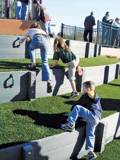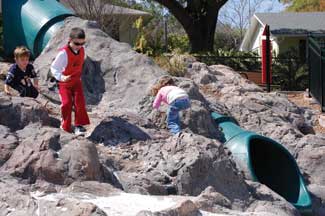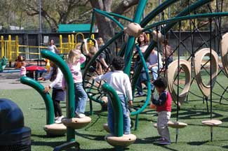 Specialty design elements, such as motion-activated interpretive signs detailing the life of a butterfly, provide learning opportunities for everyone. Motion-activated elements allow unsighted children the same learning opportunity as everyone else. The play areas are categorized by skill levels, not by age group, and are easily explained through colorful graphic and speaking signs.
