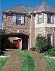 Traditional poured-in-place concrete paving methods can kill trees by robbing them of unnecessary water and oxygen. Using concrete grid pave stones for residential driveways is becoming more popular, especially in historic neighborhoods. The owner of the Dallas, Texas area home shown in the photos here was interested in this product for a variety of reasons. The aesthetics complement the architecture of the home. Although the grid pave stone is generally specified in natural gray or pewter (no pigment added), this homeowner actually chose to have the stone colored to enhance the home's exterior brick. One of the added benefits to this homeowner was the drive-up appeal and distinction the grid pave stone driveway provided her home, allowing simplicity in directions to the residence. An additional benefit is the reduction of heat absorption compared to the standard suburban driveway.