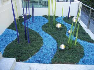 This garden features dwarf mondo grass and crushed glass that creates dynamic color contrasts and the shapes represent flowing water, with glass spikes and stainless steel spheres used as accents to create contrasting shapes.