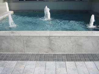 The pool?EUR??,,????'???s water spills down into a catch basin and a spa lies beyond that area of the water feature.