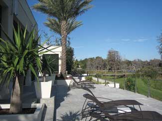 Limestone, travertine and concrete pavers are in abundance around the house, with marble and limestone flooring inside the home giving the property a strong feel. The driveway and motor court design is very geometric in shape. The gray travertine and charcoal concrete pavers create a cool color scheme and rich appearance to the front hardscape scheme. The homeowners suggested that a simple circle amidst the straight lines in the motor court be added to the design to create some diversity from the strong vertical lines of the architecture.