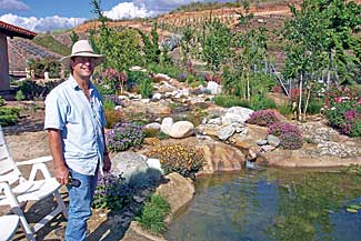 Next, we plant our valisneria living-biological-filter grass system in the pools, and even in the stream itself, to give us the crystal-clear water that is our trademark, without any filtration equipment having to be built into the pump or recirculation circuit. We like to add watercress in spots along the edges, its roots contributing to the cleaning process of the water, and its mats of vegetation creating habitat for baby fish, frog and toad eggs, pollywogs, and many other forms of life. When we selected the water-side, and water?EUR??,,????'???s edge plants for our landscaping, we used ornamental grasses frequently associated with water and areas that are moist, as well as paper white birch trees to give the feeling of my homeland mountain aspens (which will not grow successfully in warm climates or much below 6,000 feet). Added to that were a few Arctic willows with their beautiful, wispy, lacy, blue green leaves, and some splashes of wildflowers, like cosmos, daisies, zinnias, erodium and pennstemon.