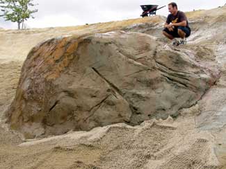 After the basic shaping is completed, then we contain the water with pond liner underneath. A layer of fabric goes over top of the liner. After that, we hand-shape the features of our stream, sometimes incorporating natural rock, and sometimes forming our own matching faux rock, with concrete. We have developed staining techniques that are permanent and natural appearing. When combined with our textures that mimic features ranging from soil, to erosions, to sand, to rounded rock, to fractured rock, to bedrock with its striations and veins- we can create whatever kind of stream and geology that we want.