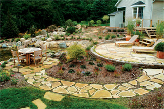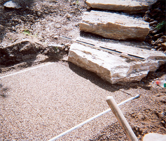 In laying natural stone, ?EUR??,,????'?????<???????????????????????????EUR???The most common mistake people make is in preparation. They don?EUR??,,????'?????<???????????????????????????EUR?????????(R)???????+?EUR??,,????'?????<???????t put down any geotextile fabric,?EUR??,,????'?????<???????????????????????????EUR??? states Ken Shecter, owner and president of Shecter Landscaping Inc., a custom design landscaping contractor who has won several awards for residential design. The fabric holds the compacted base material [21aa crushed natural stone] in place like a piece of carpeting that holds compaction without letting it sink into the ground. According to Shecter, most natural stone paving jobs for a patio or walkway start with excavating about nine inches of existing soil. Geotextile fabric is placed on the excavated site. The excavated soil is replaced with 21aa crushed natural stone (three-quarter inch crushed stone with fine materials) compacting it in two to three inch lifts for a total of six to eight inches of compacted stone.