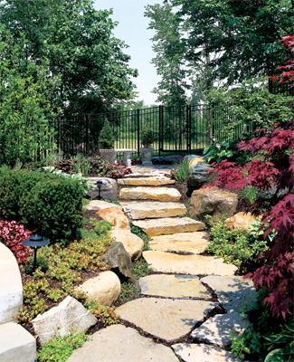 Planning the proper pitch is vital to the proper execution of stone landscape steps. ?EUR??,,????'?????<???????????????????????????EUR???Remember rise and run theory?EUR??,,????'?????<???????????????????????????EUR?????????(R)???????+???????(R)????you want to make the steps flow with the existing grade,?EUR??,,????'?????<???????????????????????????EUR??? asserts Shecter. If you don?EUR??,,????'?????<???????????????????????????EUR?????????(R)???????+?EUR??,,????'?????<???????t plan well, the next thing you know your steps are [recessed] in the ground or grade is falling quickly and the steps are coming out of the ground.?EUR??,,????'?????<???????????????????????????EUR??? Sometimes accommodating grade changes will necessitate that the steps be raised out of the ground and a retaining wall may have to be built on one or both sides of the walkway.