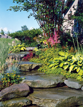 Drooger uses flagstone from a local quarry for his landscape steps. Each step is installed with a seven-inch rise. Finding the proper rise/run ratio to flow with the grade is a skill that gets easier with experience. ?EUR??,,????'?????<???????????????????????????EUR???We try to keep the walkway as level as possible, making step changes according to the grade,?EUR??,,????'?????<???????????????????????????EUR??? asserts Drooger. ?EUR??,,????'?????<???????????????????????????EUR???We may install a large flat stone area, then flow down with steps as the grade goes downward.?EUR??,,????'?????<???????????????????????????EUR???