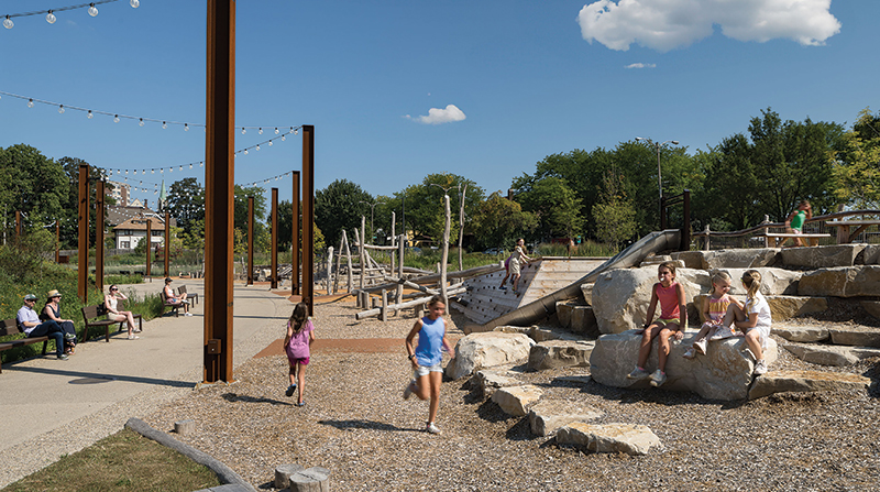 In the heart of Milwaukee, a bold endeavor to transform a lifeless corporate parking lot into a vibrant green space open to the public brought about Davidson Park - a 4-acre site centered around a flexible event setting enriched with expressive hardscape details, seamlessly integrated with gathering and play areas. Private to Public In 2021, Near West Side Partners, a non-profit organization working to improve that part of Milwaukee, engaged local stakeholders to discuss opportunities to accelerate neighborhood revitalization, which resulted in appeals for more environs that promote health, community connections, and the arts. The Near West Side (NWS) has been home to Harley-Davidson since 1903. The iconic motorcycle manufacturer transferred four acres of underutilized parking lot to the Harley-Davidson Foundation to create a public park. Its design - a collaboration between internationally-renowned Heatherwick Studio of London, England, and the Milwaukee office of national multidisciplinary firm HGA - created a vital civic landscape that honors its historical roots while offering flexible, soulful spaces for group and individual experiences.