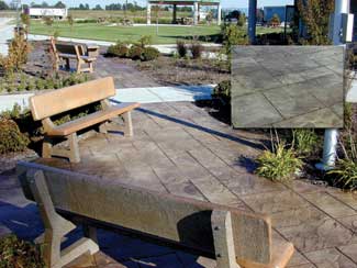 Off I-70 near Greenfield, IN, is a state highway rest area. With the use of decorative concrete, the comfort and appeal of the rest area is greatly improved. The rest stop includes walking plazas and decorative walkways where benches provide an enjoyable place to relax. The areas were created by the use of old English slate concrete stamps, color hardener, and color release. The concrete finish was color matched and coordinated with the benches and landscape to achieve the design.