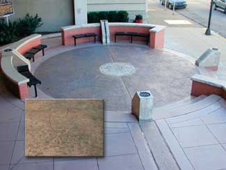 Crossroads Plaza is a hardscape commemorating and acknowledging the city as the crossroads of river, road, and rail transportation systems. Crossroads Plaza used several decorative concrete techniques to give the space both style and durability using a texture skin pattern, saw cuts, integral color and sealant. With the main circular area containing an engraved limestone medallion, the workability of the various concrete treatments made a difficult task easy, saving labor time and providing a better-finished product. Colored concrete also allowed the project to meet tight budget constraints.