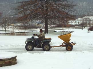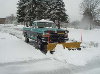 A 1997 Ford F350 four-wheel drive pickup truck with a Fischer seven-foot electric plow keeps the drives clear in the winter. A concrete vault lid in the back of the F350 provides traction. To clear access to a burial site, we use a Toro snow-blower, or a four-foot, rear-mount Canadian snow blower, powered by the Satoh?EUR??,,????'???s PTO. We also have front-mount plows for the dump truck, the 140 and a rear-mount for the Satoh, if needed.