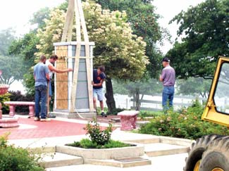 This past summer, 300 feet of colored lock-block retaining walls were set to line the entrance drive of the Garden of the Ten Commandments. A trench along each side of the roadway allowed the first tier of blocks to be set below-grade on a gravel bed. Because of the grade, the wall is staggered as it climbs the hill, four blocks high to meet the grade of the adjoining lawn. Pin oak and spruce trees along the road have been incorporated into the new beds. Sod has been removed and the beds leveled and mulched, ready for planting. Natural stone retaining walls along the boulevard in the center of the garden are scheduled to be replaced in 2006 when we have manufactured enough blocks for that project.