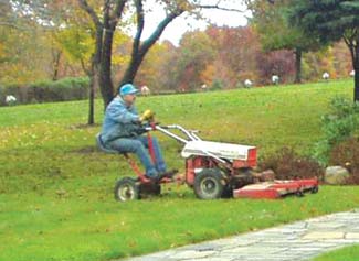 Our mowing schedule divides the cemetery into two sections, which are mowed on Thursdays and Fridays of each week. If a mowing is cancelled because of drought?EUR??,,????'??+or as we had the last two summers, excessive rain?EUR??,,????'??+we do not mow the section until the following week. This constant schedule allows our families to always know when their section will be mowed. The only exception to our regular schedule is Memorial Day weekend when our staff, with Ed on the 140, Rick Mitchell on the Gravely and Jesse Schlopy with a weedy, mow and trim the entire park on the Thursday before the holiday.