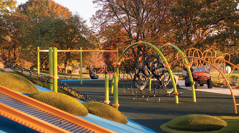 Des Peres Park Playground is a new, innovative play area located in Des Peres, Missouri. St. Louis-based landscape architecture firm Planning Design Studio led the design and implementation of this play area with the assistance of various project partners. This new playground was originally proposed as part of the 2016 Des Peres Park Master Plan, which emphasized relocating the park's playground to the location of an underutilized basketball court. Almost a decade later, this playground has set itself apart as it has evolved into a beloved community gathering space.