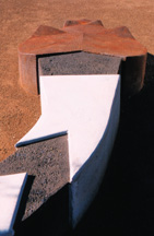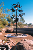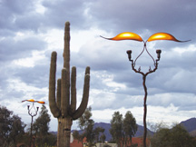 Desert Garden is a 5-acre public park in Scottsdale, Arizona. The goal of the project was to transform a flat and barren dirt parcel into a multi-sensory garden that conveys the landforms, landscape habitat and environment of the Sonoran Desert in an informative and fun manner. Floor & Associates, Inc., a Phoenix-based Landscape Architecture firm, lead a multi disciplinary design team, including The Thinking Caps Partnership - environmental graphics, and Entellus - civil engineering. During the construction phase of the project, the team encouraged the City of Scottsdale to hire a well-known metal sculptor, Joe Tyler, to fabricate the various interpretive elements - including the lights - incorporated throughout the garden. The overall concept for Desert Garden was to replicate the three distinct bio-habitation zones that exist in north Scottsdale?EUR??,,????'???s Sonoran Desert: the valley floor, the upper bajada and the desert washes. Starting with a totally denuded remnant parcel of land, the design began with the creation of landforms that convey the sense of place of each zone, including a desert wash running through the middle of the garden. The appropriate landscape was then created for each zone by utilizing strictly native plant materials. To create interest and fun, the design team incorporated a variety of unique hardscape, sculptural and interpretive elements that draw the visitor down a path of discovery through the garden. Great emphasis was placed on unique and inventive construction detailing and the incorporation of art and educational elements throughout. Included are larger than life representations of desert life, including plants, cacti, mammals, reptiles, insects and birds, along with a series of story panels, written by Jill Spear, through which the garden?EUR??,,????'???s resident host, Kwaatsi, treats the visitor to a tour. The Desert Milkweed Lights To the greatest extent possible, all site elements found at Desert Garden were specifically designed and custom fabricated for the garden. As a desert interpretive garden, the goal of the design was to create an organic feel for all aspects of the place, including form, material palette and color palette. This included such elements as the signage, trash receptacles, seatwalls and, in particular, the site lighting.As a ?EUR??,,????'??dawn to dusk?EUR??,,????'?? facility, the lighting concept was to create subtle lighting along the main paths without lighting the entire garden. Special emphasis was placed on eliminating light trespass from the property, both to address adjacent neighborhood concerns and the environmental concerns of light pollution. To accomplish these goals, Floor & Associates developed a concept of indirectly reflected lighting that washes the paths with subtle light without over lighting the garden. The solution was to design a relatively large reflector mounted atop a pole with the light source directed upward under the reflector, reflecting a diffused glow back to the ground. After working through a series of conceptual studies, a member of the firm found a dried seedpod from a desert milkweed plant that had opened in an elegant reverse curve shape. This shape became the basis for the shape of the reflector, which was then mounted on top of an organically designed pole. The light fixture itself was mounted on top of the pole directly under the reflector on an adjustable bracket to allow aiming to be done in the field. There are a total of 16 of these ?EUR??,,????'??Desert Milkweed Lights?EUR??,,????'?? within Desert Garden, including both single- and double-headed configurations. During the day, the lights become interesting sculptural elements that complement the other sculptural elements throughout the garden. At night, they provide subtle path and security lighting. Joe Tyler fabricated the fixtures. The Snake Walks The Garden is organized around a central gathering space that is arrived at by following one of three sinuous concrete walks, laid out and patterned in the forms of huge snakes. Each walk has its own distinctive color palette, pattern and texture. Visitors enter the garden from one of three points and soon discover they are on the back of a huge snake, starting at the tail and walking towards its head. The tail sections, each measuring approximately 8-feet wide by 20-feet long, are segmented to resemble the sections of a rattlesnake?EUR??,,????'???s rattle and are made of thousands of tightly packed iron spheres, transitioning in size from 3/4-inch to 2-1/2-inches in diameter. The iron spheres are set into integrally colored concrete and form a fascinating flatwork texture, reminiscent of an actual rattlesnake?EUR??,,????'???s rattle. The ?EUR??,,????'??rattles?EUR??,,????'?? transition into a series of hand placed river rock textures that, in turn, transition into a diamond patterned concrete walkway. The diamond patterns were created using three different expanded metal stamping devices created specifically for Desert Garden. At 40-foot intervals, 2-foot wide accent panels were separately poured in the shape of diamond chevrons. The surface of each accent panel is seeded with over 2,000 colored glass marbles to lend a sense of magic to these huge snakes. In total, more than 120,000 marbles are incorporate into the Garden?EUR??,,????'???s three walkways. As one follows the walks towards the Central Gathering Place, one by one they join together until they finally reach the snake?EUR??,,????'???s head, which rises from the walk and is formed of hand placed river rock, set in a scale-like pattern. Befitting the scale of the ?EUR??,,????'??bodies,?EUR??,,????'?? the head is huge, measuring 18-feet wide by 28-feet long. The black concrete tongue is even longer, curving through the landscape for more than 60-feet to intersect with one of the walkways. The snake?EUR??,,????'???s eyes and nostrils are made of rusted steel. The Compass Spiral Away from the concrete Snake Walks and the Cen