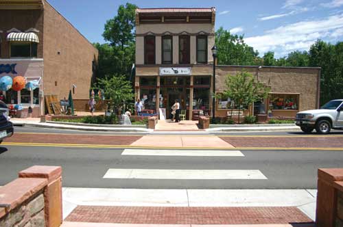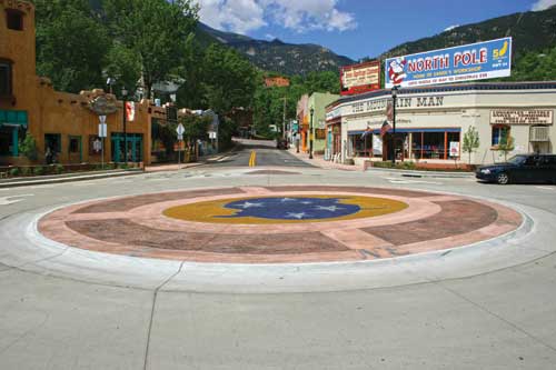 • Removal and undergrounding of overhead utility lines and the removal of associated utility poles, thereby eliminating a source of significant visual pollution and opening up views of the streetscape and surrounding mountains. • Landscaping to enhance the visual appeal and ambiance of the downtown. • Bump-outs at pedestrian crossings with seat-walled planters that improve pedestrian safety and provide space for landscaping and additional seating. Bold striping identifies the crosswalks across the travel lanes, with the same colored concrete used for the sidewalks cutting across the center lane. • The design and construction of a totally mountable roundabout at the Ruxton Avenue/Manitou Avenue intersection.