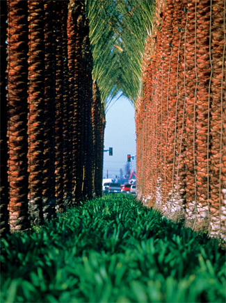 The two main streets that intersect by Disneyland are Harbor Blvd., running north to south, and Katella Ave., running east to west. These streets border the amusement park but several other private businesses as well. The idea for these two streets was to unify the design so that Disney wasn?EUR??,,????'???t doing one thing and the landowners across the street were doing another. Jacob estimates that nearly 15,000 trees and other plants were used on the project. On a two-mile stretch of Katella alone there are several thousand date palms. To help orient visitors to location, landscape treatments vary according to the street. For example, Katella has the palms, while Harbor is planted with large, spreading, flowering, tropical trees.