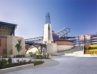 As spectators enter the open corner of the north end zone they pass under a concourse connecting bridge and the lighthouse tower. The surrounding oceanic landscaping is reminiscent of the New England ocean side. The landscape around the lighthouse has large boulders culled from the New England counrtyside.