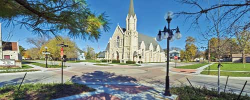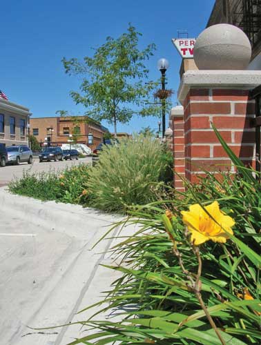 A buffer zone was created along the back of curb line on both sides of the street. This buffer strip was reserved for lighting, street trees, signage, plantings and special paving. This zone also included a series of brick pillars and ornamental fencing meant to create visual and physical barriers between vehicular and pedestrian space. Pedestrian space comprised an eight-foot wide concrete sidewalk with decorative paver insets along both sides of the street. This space allows for pedestrians to pause and window-shop and sit down on the benches designed into the project. This space provided an opportunity for property and business owners to participate in the revitalization effort by placing potted plants or other elements outside their establishments. Step one construction was completed in one construction season and dedicated in conjunction with Perry’s fall festival, Sentimental Journey.