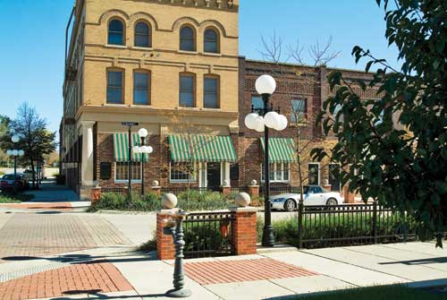 Downtown Revitalization, Step Two Only two years after completion of step one, the city began construction of a much larger step two project. This component included extensive underground utility work in preparation for roadway replacement and streetscape improvements. Above ground, step two included three blocks of new street and paver intersections, plus completely rebuilt sidewalk and streetscape amenities and landscaping. The intersections represent the major hub of the revitalization efforts, including bump-outs for added pedestrian space, along with colors forming a simple circular pattern. The inspiration for this circle form can be traced to many of the architectural elements found throughout the downtown area. Consistent with step one improvements, the streetscape design for step two included a separation of vehicular and pedestrian space. Plant material and site furnishings were chosen to continue the character established in the step one project. Crosswalks and sidewalk jointing patterns were also a continuation of patterns defined in step one.