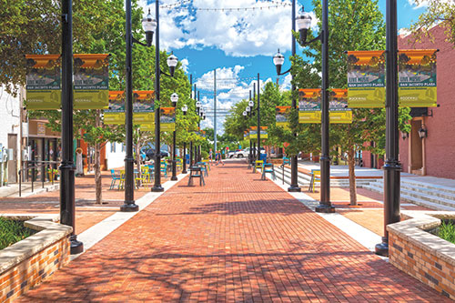 To provide the best chance possible for these large trees to flourish in this urban environment the design team created root zone areas in line with the trees using DeepRoot "Silva Cell' system, which required digging an 8' wide, 6' deep and 150' long trench. Silva Cell is a modular suspended pavement system. Each cell has a frame and a deck. The cell, about 92 percent void space, is lightly compacted by soil to support large tree growth and manage stormwater. While this area is reserved for pedestrian activity, it was necessary to create a surface that could support a utility truck, delivery vehicles or food trucks. The space has become a true community urban park in the heart of downtown. Shoppers stop to sit for a moment under the trees; events are held regularly, including live music every Friday and Saturday night throughout the spring and summer.