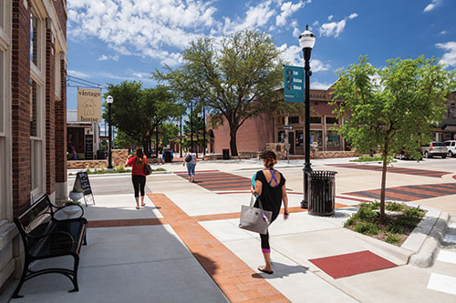 This commitment by the leadership of the Rockwall community has put in place the mechanisms that resulted in a true transformation of the downtown area. The $8.625 million voter approved capital improvement project focuses on strengthening the historic downtown core by creating a pedestrian connector along San Jacinto Street, beginning north at Olive Street and continuing south to City Hall. Blocks of historic buildings in the classic small Texas town layout surround Courthouse Square in the middle of the downtown. With buildings and some infrastructure dating to the late 1800s and early 1900s, the downtown Rockwall had been patched over time. Built in the time of wood sidewalks and dirt roads, the typical Texas historic Courthouse Square has challenges with access because the original building finished floor elevation is usually one to two feet higher than the street. ADA accessibilty was difficult or nonexistent throughout the area. Establishing cohesive connections within the downtown area is equally important in creating a pedestrian friendly destination.